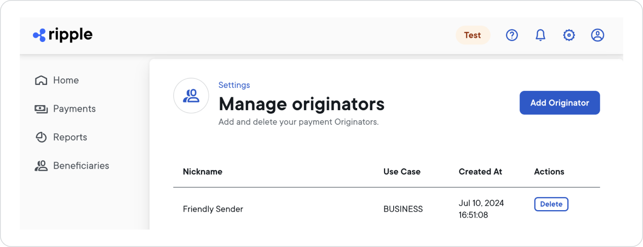 The originator management feature allows you to add or delete payment originators using the Ripple Payments UI.