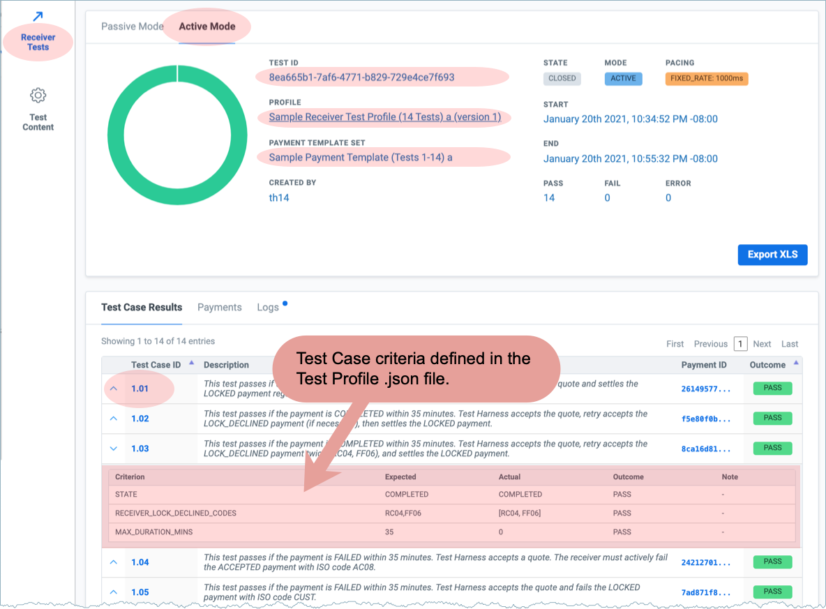 To run tests in active mode, the Test case ID must be defined within the payment's user_info and it must be prepended by TCID-. For example, if a Test Profile defines "test_case_id": "1.01" then user_info in the payment must include {"TxId":"TCID-1.01"}.