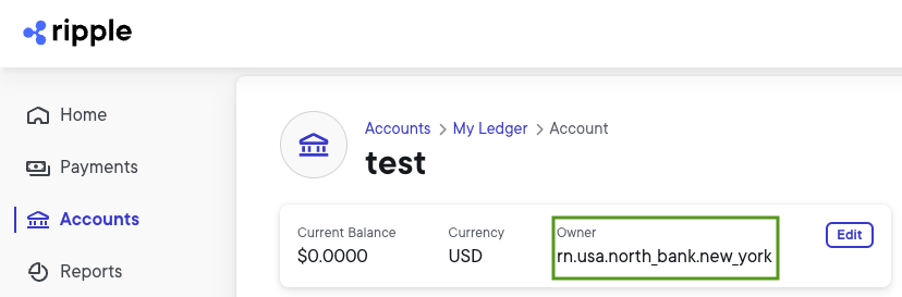 Select Accounts and then the account you want to use for the payment. The value you see under Owner, is theRIPPLENET_ADDRESS.Example: