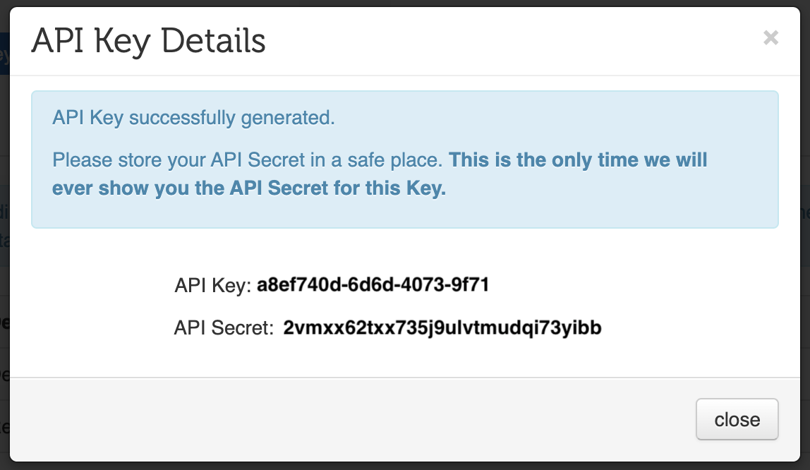 TipMake a note of the alias you define for your API Key/Secret. After you generate your API Key/Secret, you can retrieve them using this unique alias in the future.