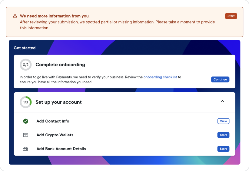 In the following example, the user has completed two out of three tasks related to onboarding, which must be completed to verify their business. The user hasn't completed any tasks related to account setup, which must be completed to make payments.