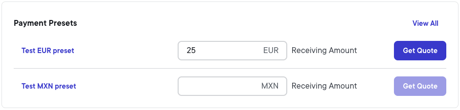 - Use a preset -- To use a payment preset, enter the sending or receiving amount as specified and then click Get Quote. On the New Payment page, you can then complete the payment information and get a quote.