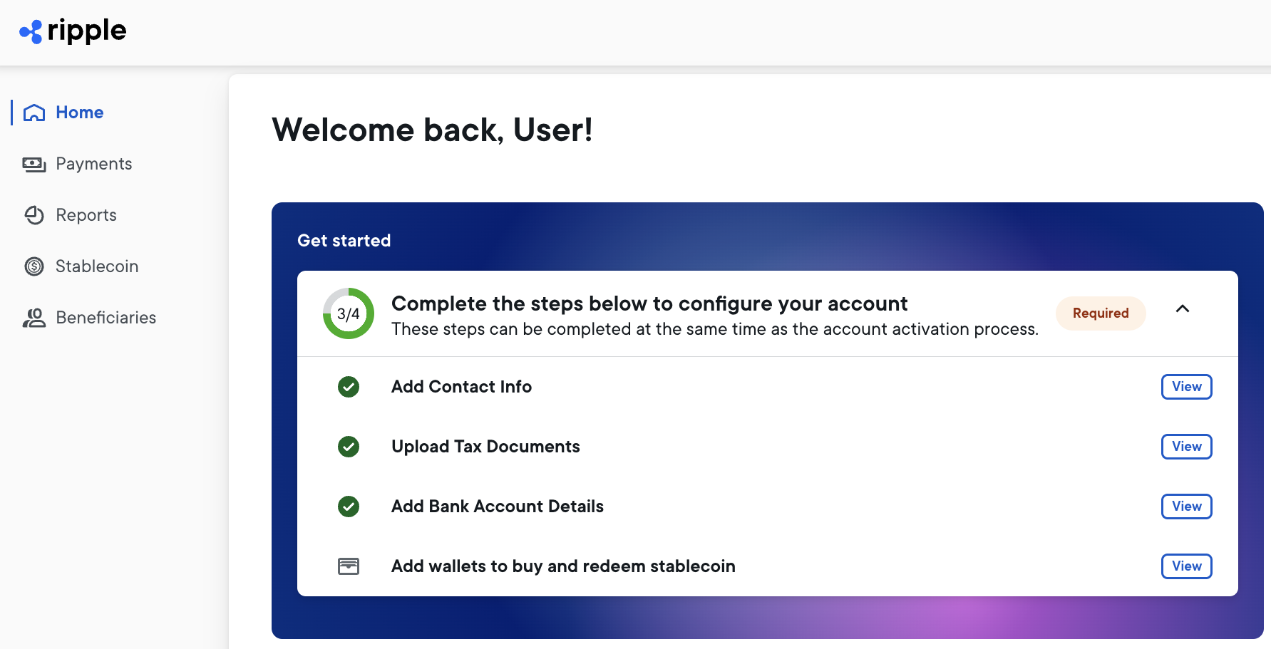 - An email with subject line, Welcome to Ripple! with a link to the Ripple Onboarding portal (the home.ripple.com site).