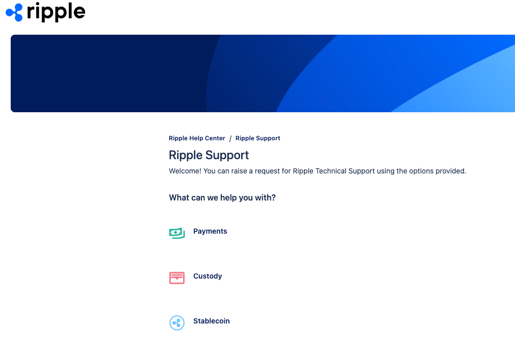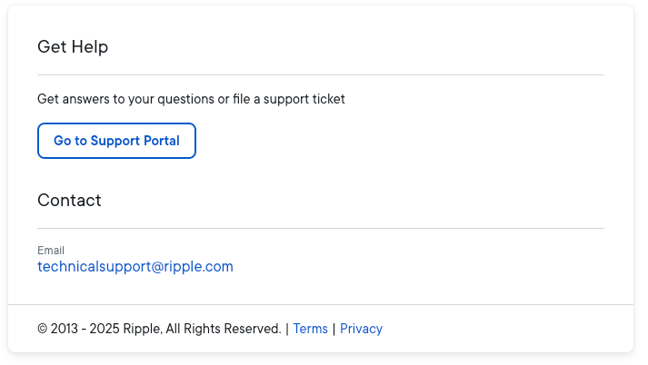 NoteThe Go to Support Portal link is highly recommended as the preferred way to contact Ripple support. The alternative email address is provided primarily in case you have problems reaching support via the Support Portal.
