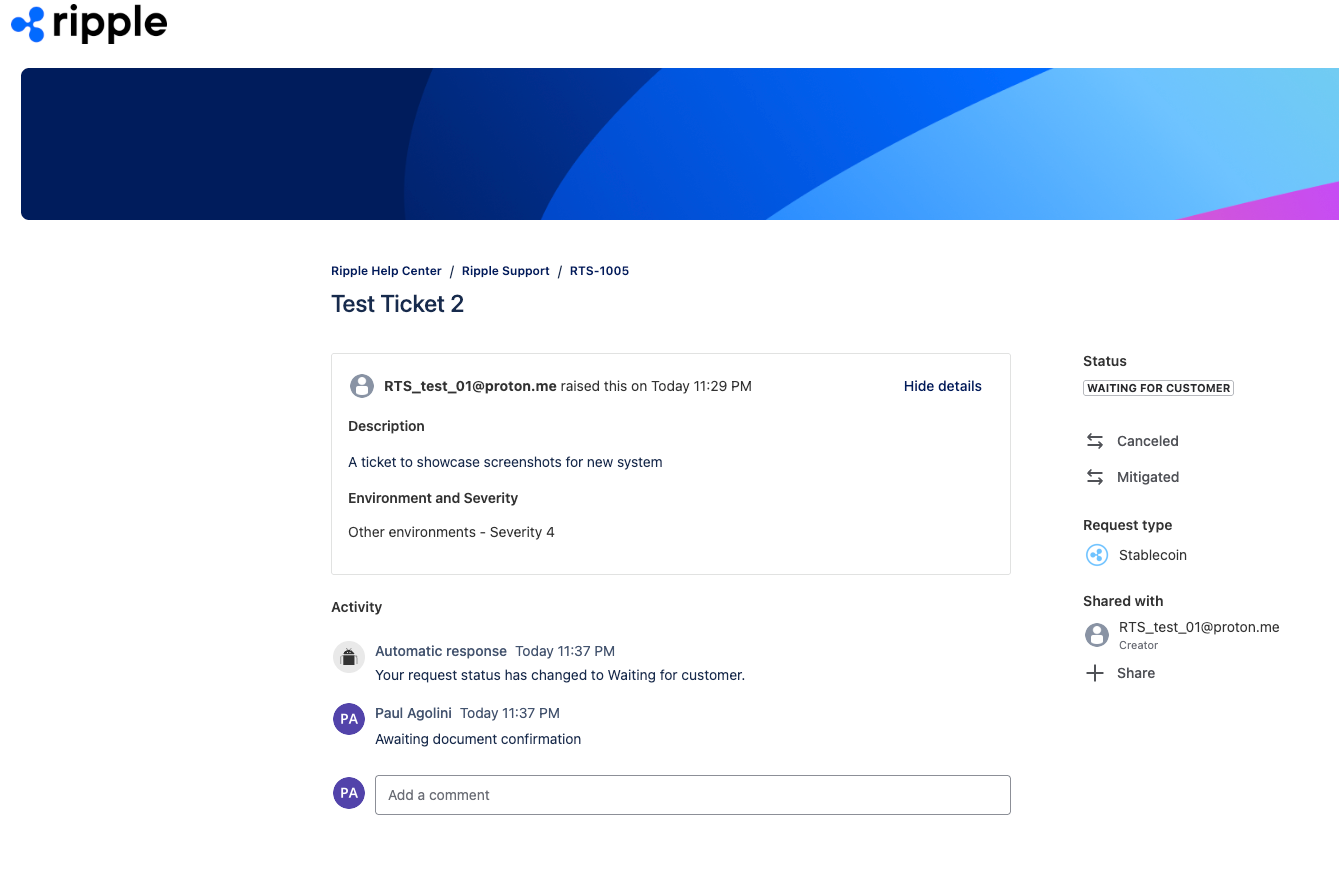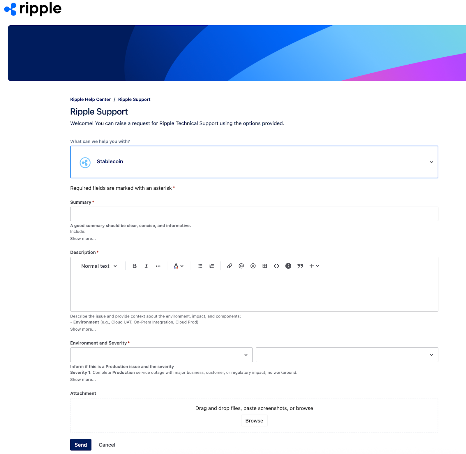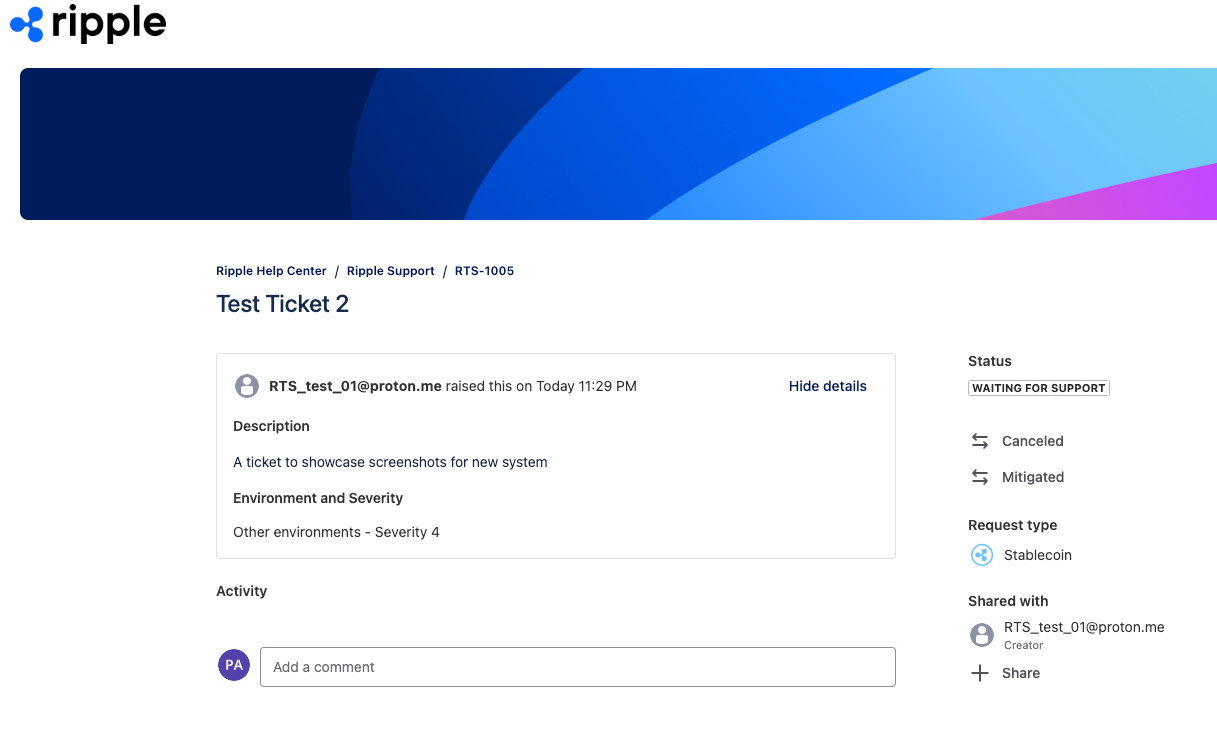 You can report an incident and manage your support tickets through the Ripple Services Support Portal.